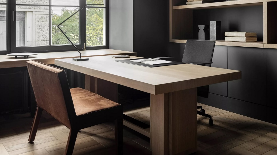 Рабочую зону можно дополнить мебелью и аксессуарами со строгими линиями, фактуры кожи, дерева, металла.