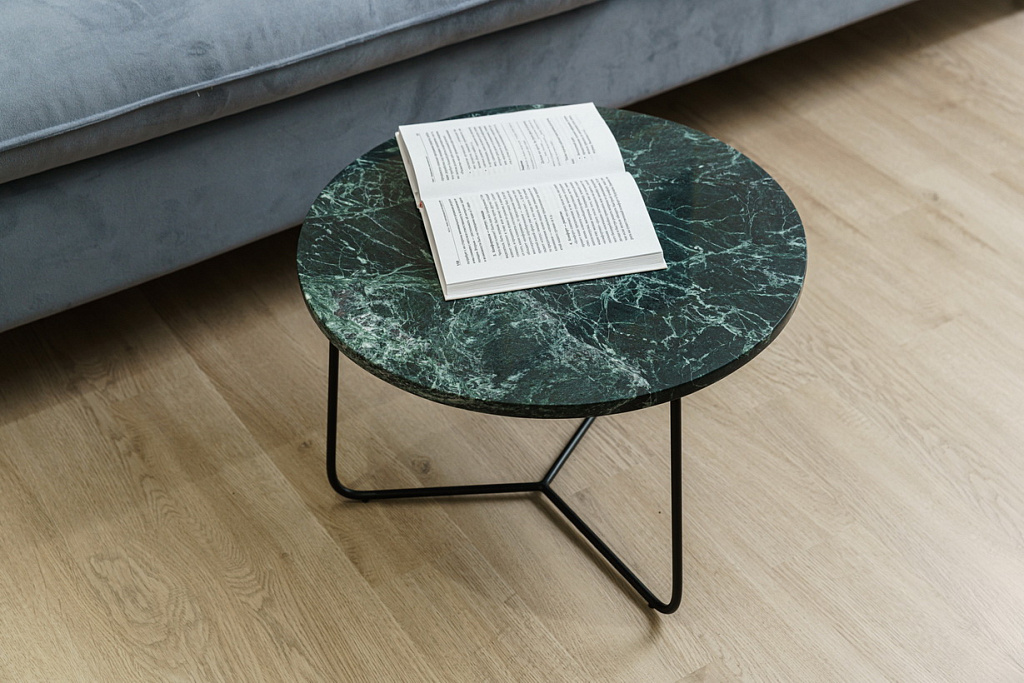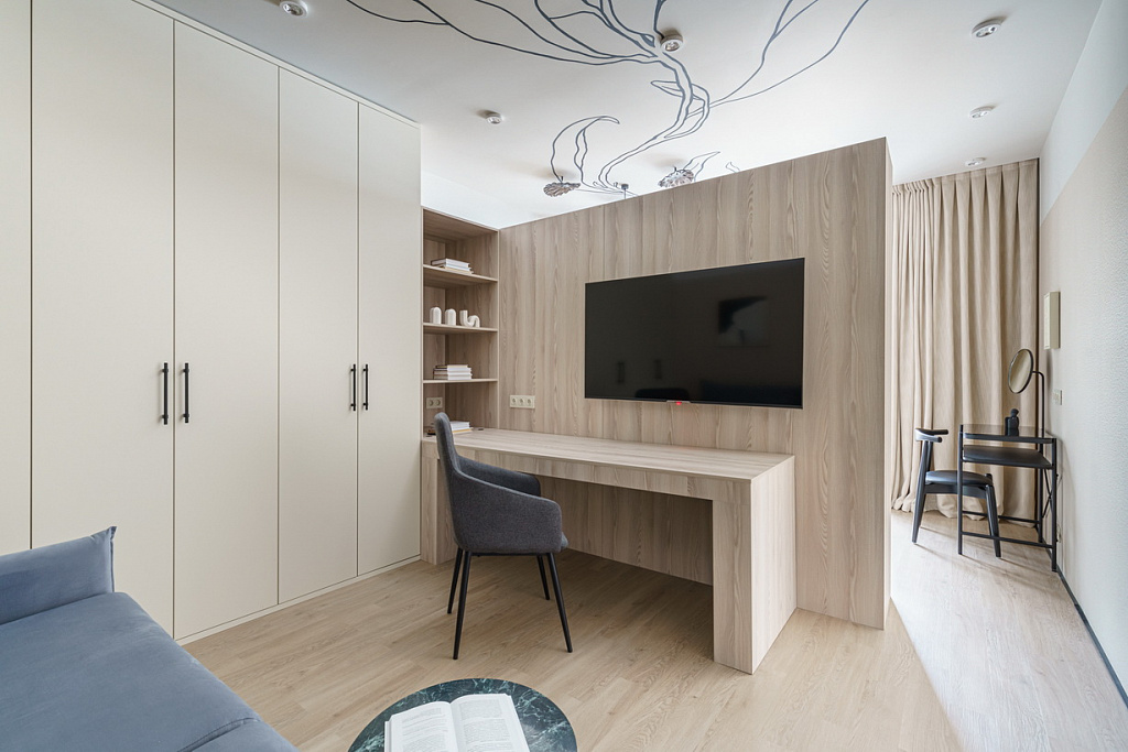 Спальню-гостиную покрасили в бежевый цвет, в центре комнаты возвели стену, а потолок украсила роскошная ветвь. Дизайнеры искали светлый, эстетичный и практичный пол и остановились на кварцевом ламинате Fargo Comfort Ясень Белый JC18001-35.